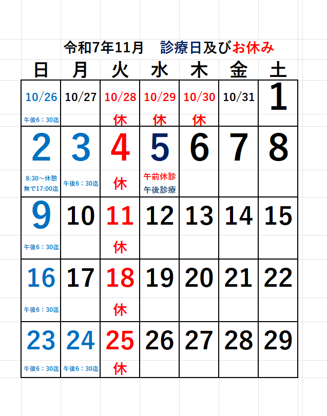 | 午前 | ○ | ✕ | ○ | ○ | ○ | ○ | ○ |
